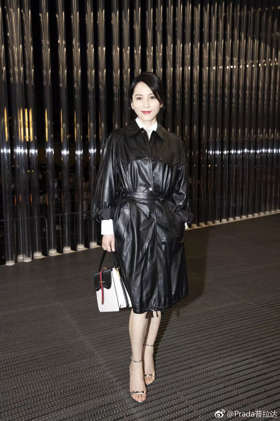不老女神俞飞鸿也出现在这次的秀上,黑色Prada皮革风衣展现了她气质以及帅气的一面。再提上Prada Belle手袋,黑白配和Prada严谨的风格暗暗契合。