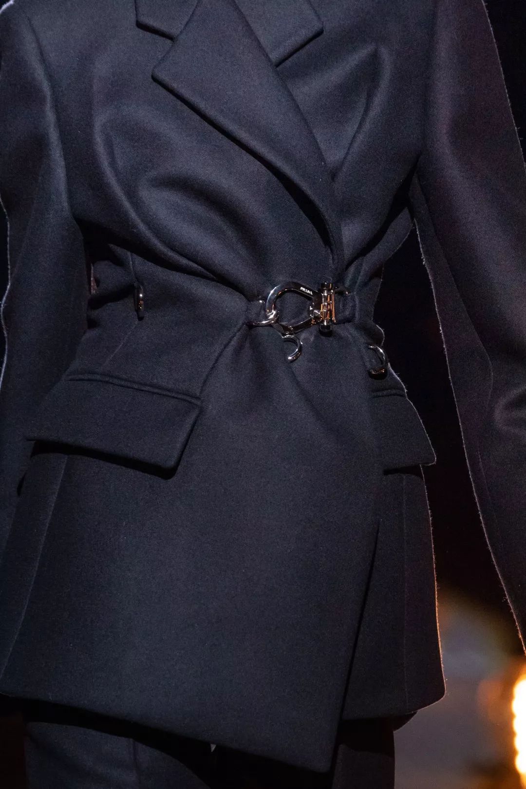 所以这次也没有少一些中性化的小细节。就像下面这些外套,中间都加入了坚硬的铁环来强化中性特征,彻底“硬”到底,但是收腰的效果又保留了曲线。