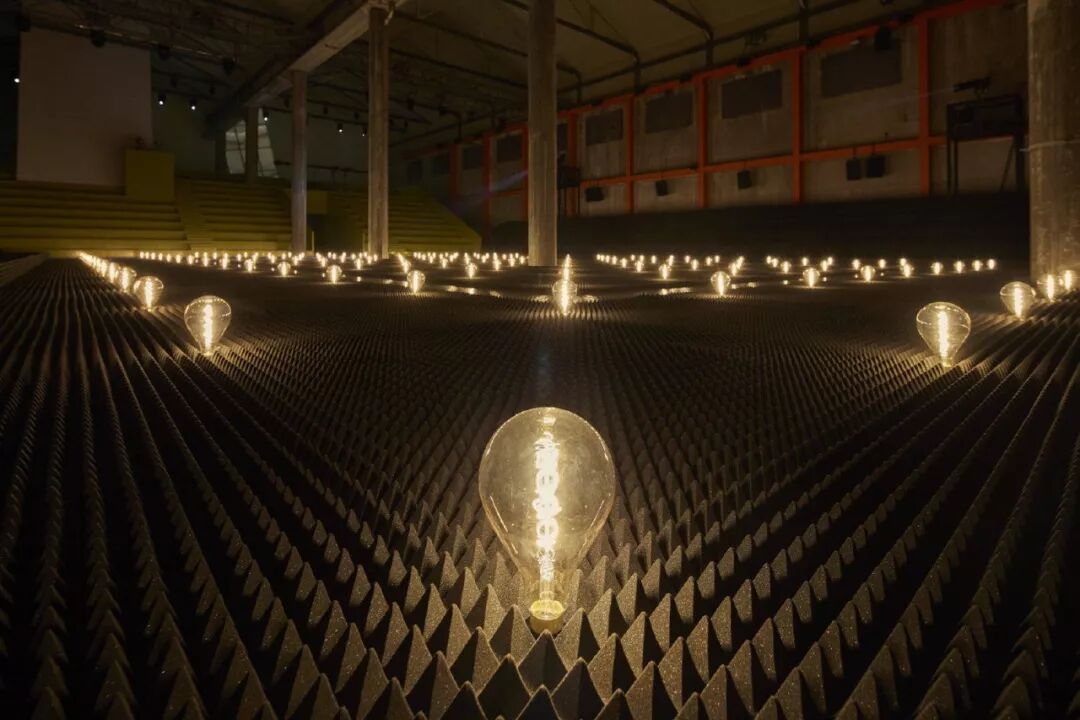 灯泡就这样一个个立在地上,发着暖黄的光,颇有哥特式小说中的场景。配合上音乐以及灯光,打造一个光怪陆离的空间。