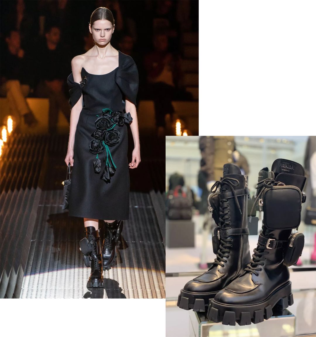 靴子基本都是充满工业风且中性的风格,很好的综合了上半身的裙装,毕竟太过女性化太过柔美就不是Prada了。下面这双靴子出现过很多次,靴子两边自带“腰包”,取下来还可以当零钱包使,买鞋还可以送包有没有觉得很赚~