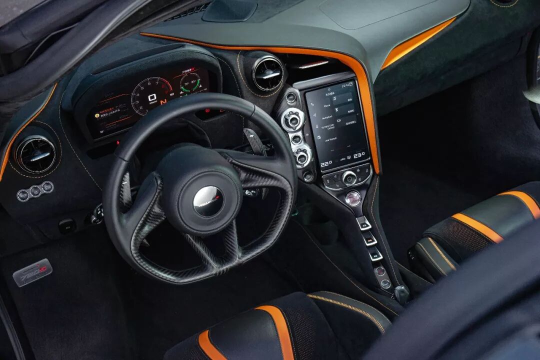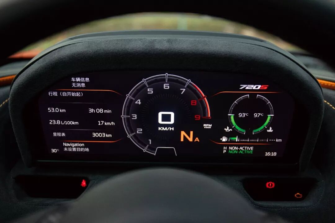 720S采用了新颖的折叠式仪表盘,在隐藏模式下,只有车辆的基本信息,如挡位、发动机转速、车速,适用于赛道驾驶;而另一个显示模式,8英寸的TFT液晶显示屏自动翻起,显示信息更加全面,让人如同置身于科幻战机的座舱。