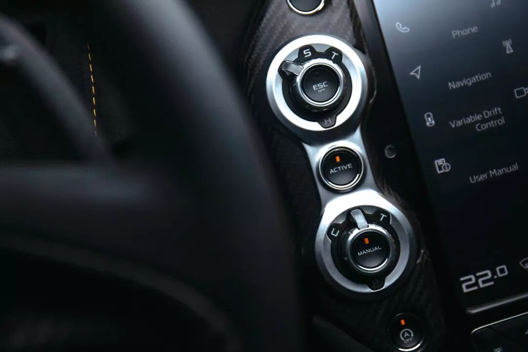 绕到车侧,你知道它炫酷的车门是怎么打开的吗?网上曾流传有富豪买了台迈凯伦,却在众人面前怎么都找不到车门把手而尴尬不已。720S的进门方式很隐蔽,在车门腰线的下方,而当蝴蝶门在你面前向上打开时,身旁的路人都会为此惊呆。带着众人的艳羡坐入车内,优雅地关上“蝴蝶翅膀”,这一刻时间仿佛都静止了,脑补的画面只有“起飞”。但,你首先得找到车内的各个开关,因为独特的它设计了和一般车辆不同的功能按键,比如座椅、反光镜都在右手边中控台进行调节,第一次上手迈凯伦的驾驶者都会比较懵。此外,换挡也是按键式。习惯了这些驾驶前的准备工作,再仔细欣赏下它内饰设计的其他特别之处。