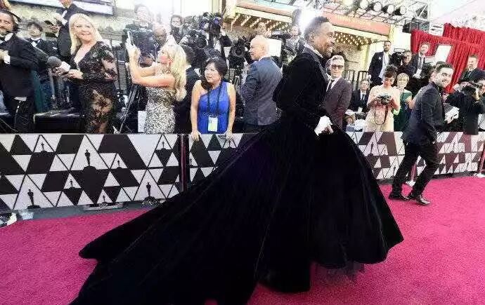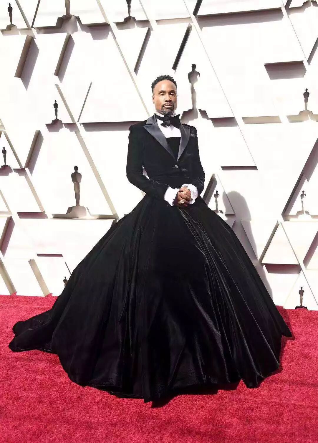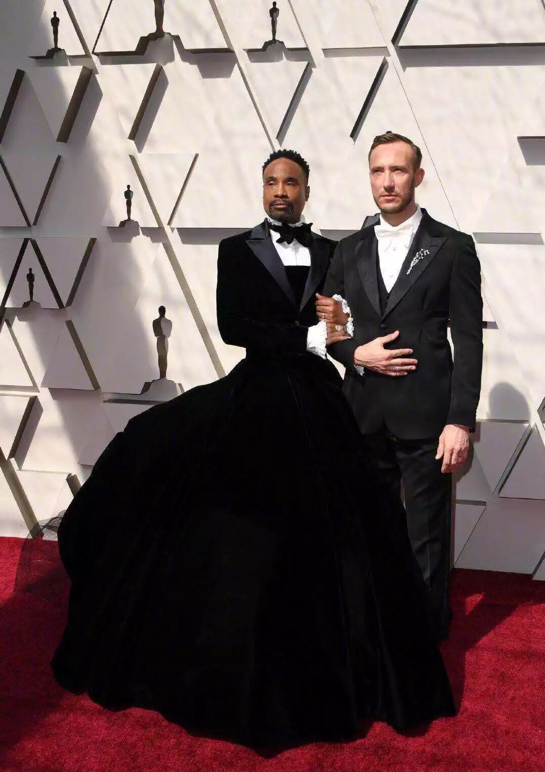Billy Porter身穿这条来自Christian Siriano的黑色长裙与爱夫Adam Smith现身第91届#奥斯卡#