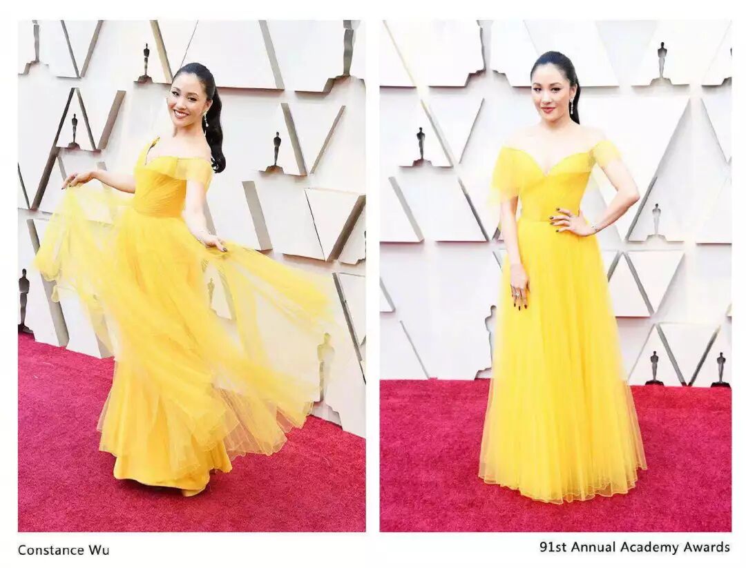 同样来自《摘金奇缘》的Constance Wu,身穿亮黄色开胸长裙~