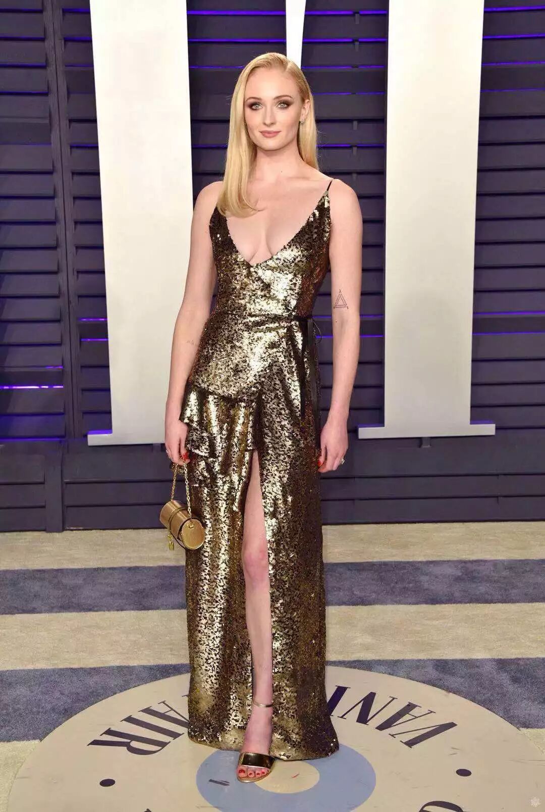 Sophie Turner身穿金色开胸长裙,不仅是权游里的公主,整个人就像一位住在城堡里的公主,华丽,美艳~