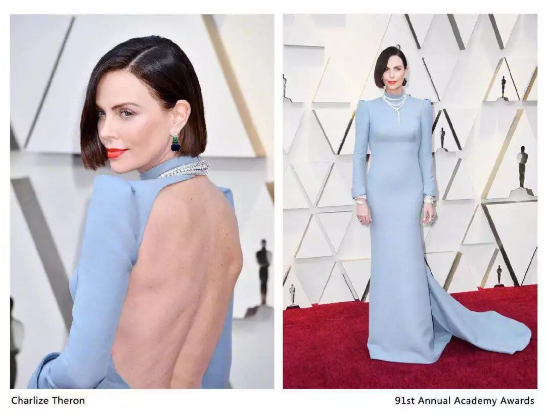 影后Charlize Theron身穿Dior高定礼服,浅蓝色的长裙搭配Bulgari珠宝,妥妥的影后气质。