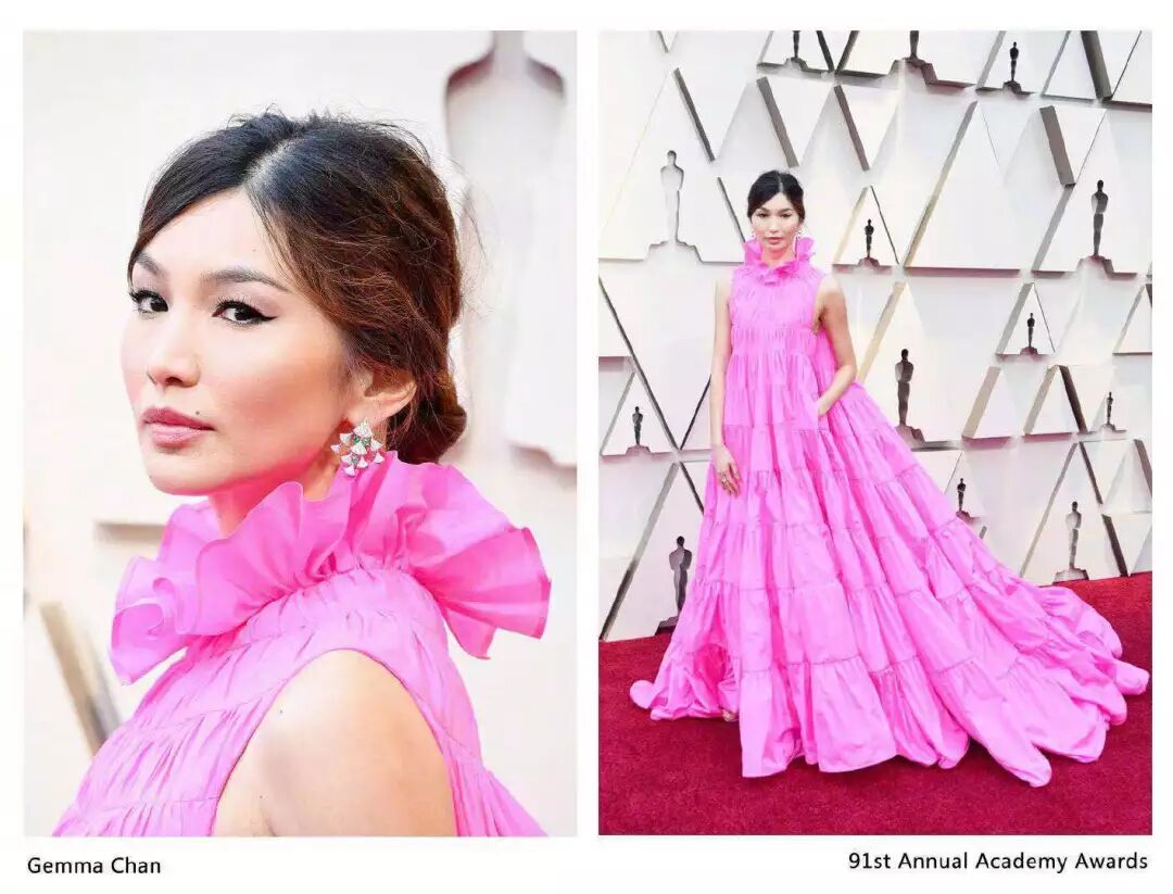 和杨紫琼一起来自《摘金奇缘》的Gemma chan,身穿粉色长裙(能驾驭住这件衣服真不容易