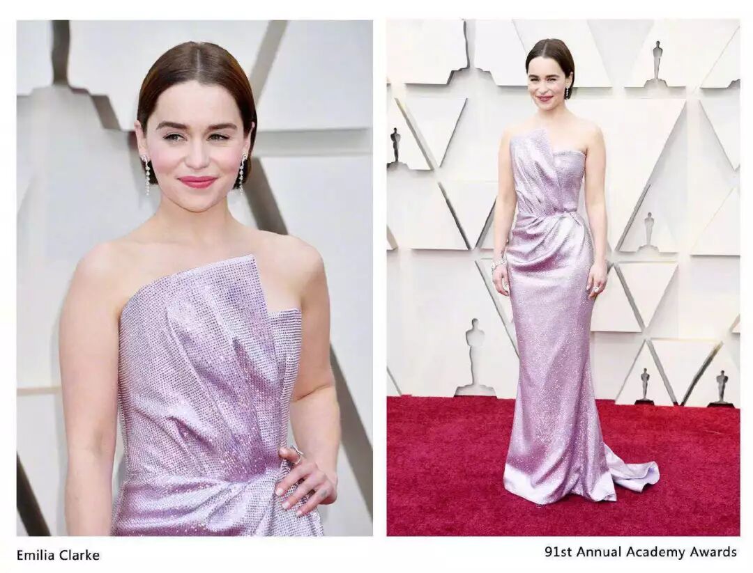 龙妈Emailia Clarke身穿紫色亮片抹胸长裙,笑容依然让人很开心~