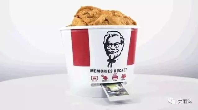 除了护肤彩妆,KFC在2015年还推出过一款类似“拍立得”的跨界产品,外形和普通的全家桶无异,桶内也是正常的原味鸡、鸡翅组合,差别在地步内置了小型打印机,可以通过手机APP直接打印相片。