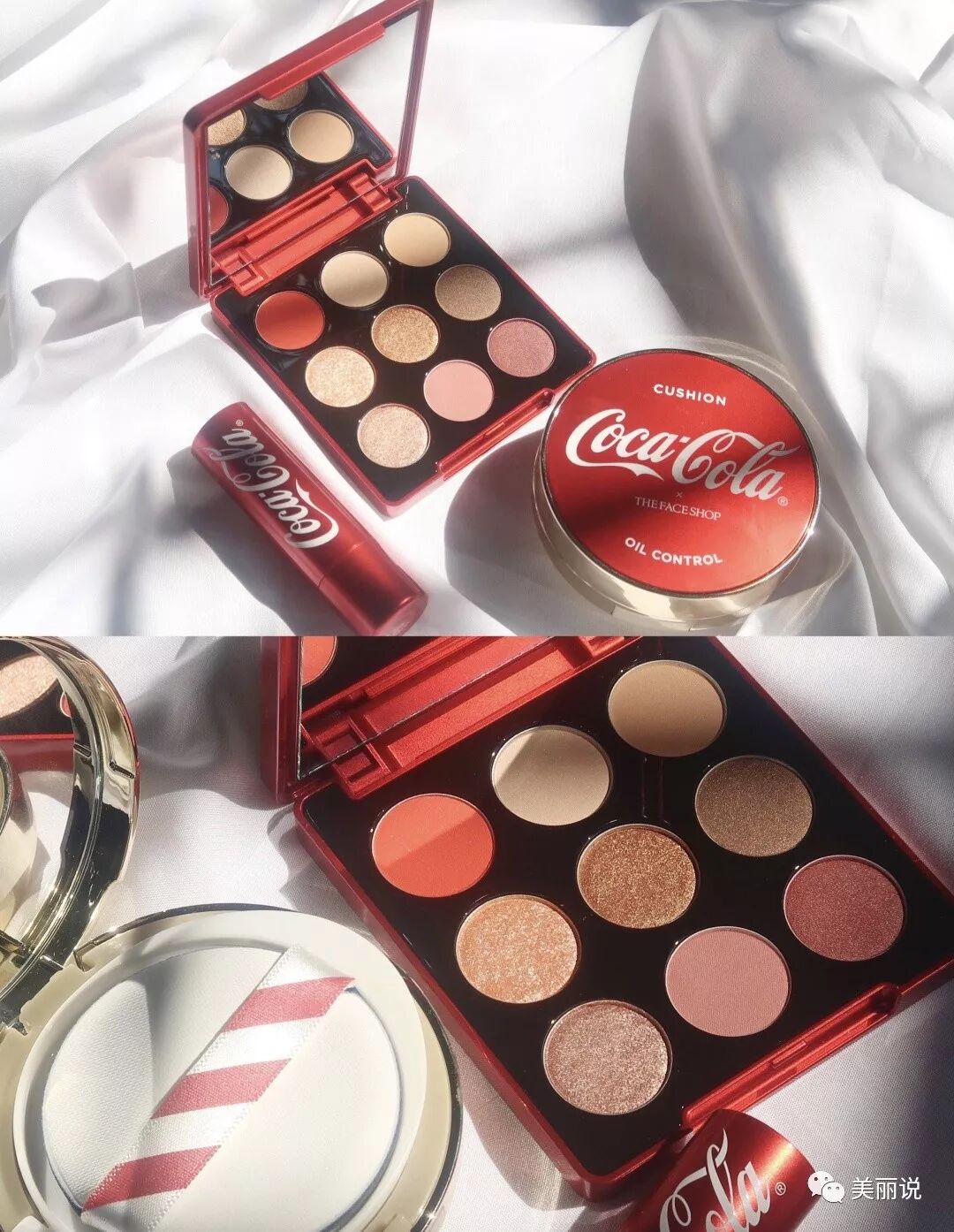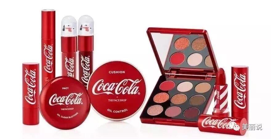 除了服饰,在今年8月,可口可乐和韩国彩妆品牌The face shop还联名推出过限量彩妆。