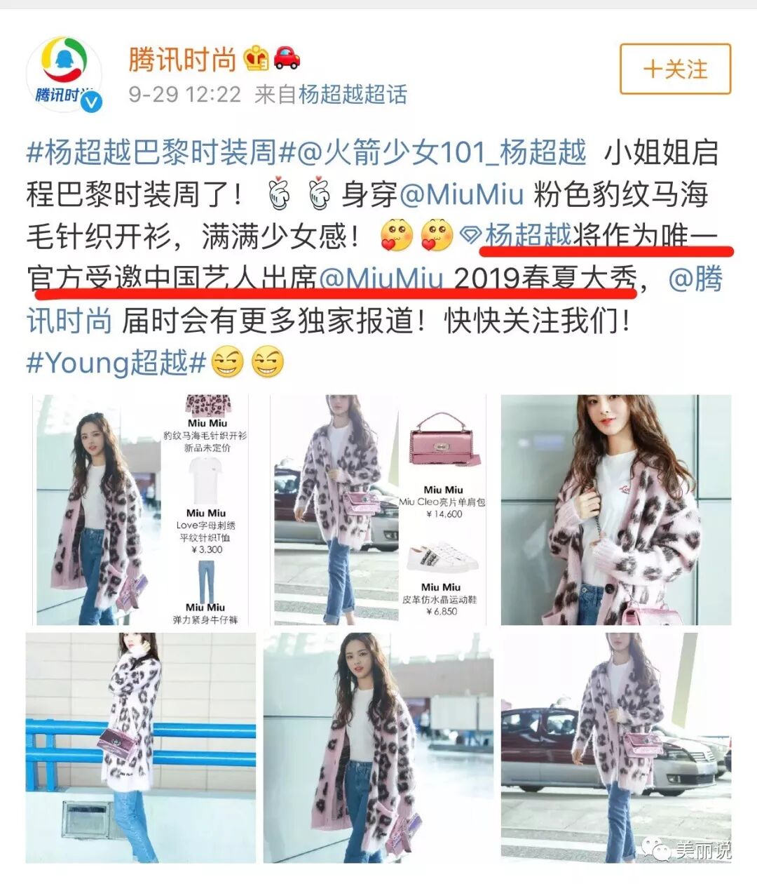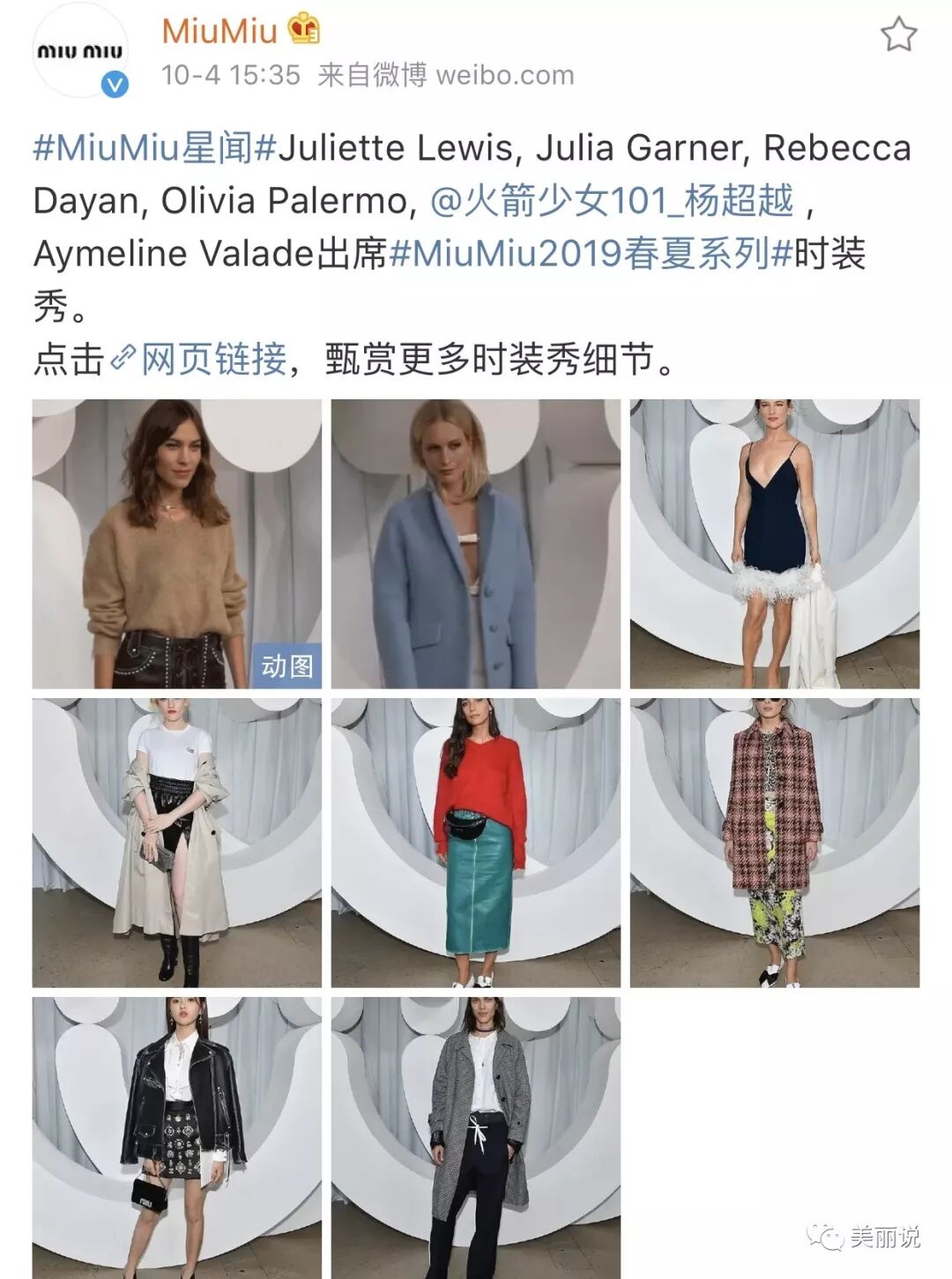 Miumiu官方也非常给面子,在看秀那天把杨超越放在一堆外国女明星里宣传,还艾特了本人。