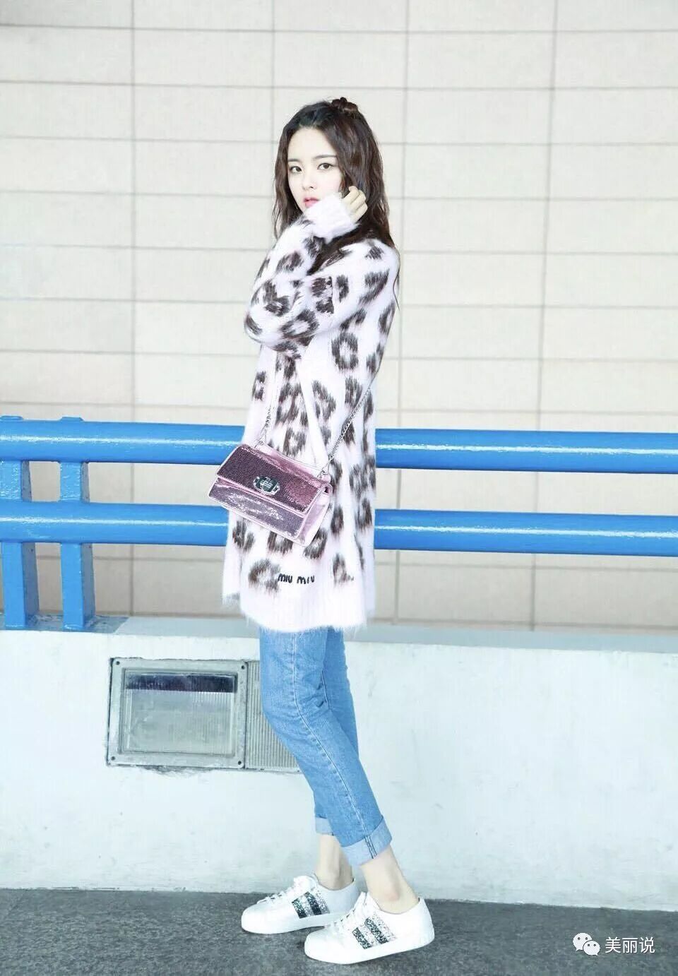 Miumiu新品豹纹马海毛针织开衫(未定价)搭配Miu miu love字母刺绣平纹针织T恤(RMB 3300),下身为Miumiu 紧身牛仔裤(RMB 5600),包包为Miu Cleo亮片单肩包(RMB 14600),鞋子则是Miumiu水晶运动鞋(RMB 6850)。
