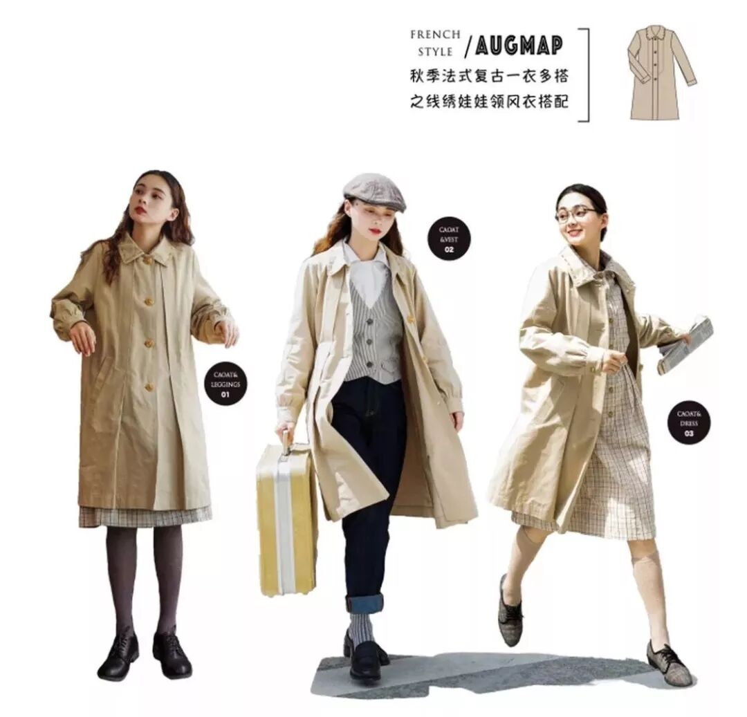 线绣娃娃领与挂面明线,袖口抽褶设计的法式风衣,搭配连衣裙小皮鞋就已经流露出浓浓的复古风情。