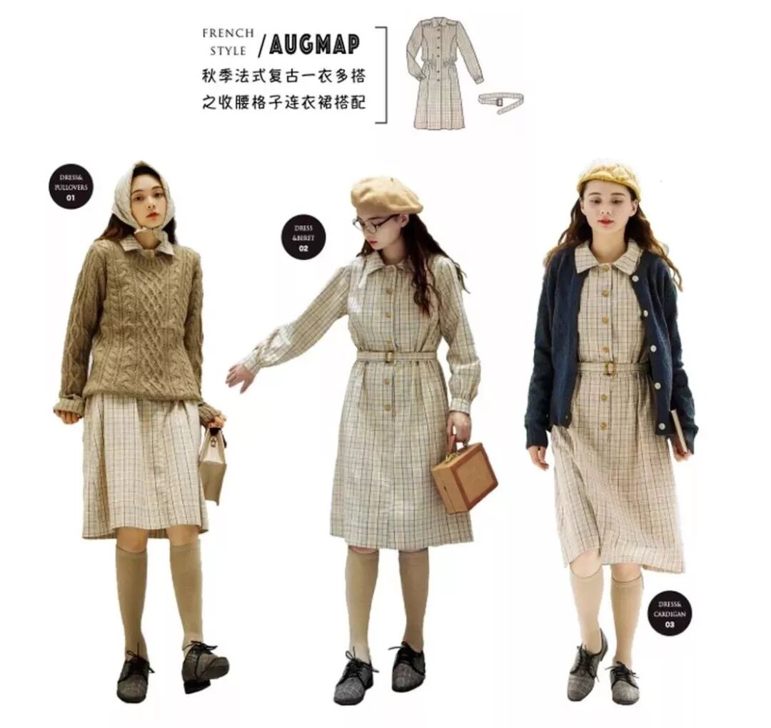 LOOK 1:连衣裙+麻花毛衣+格子皮鞋