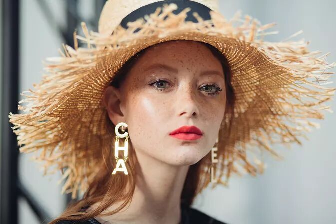 在logo的变化上我还发现一个有趣的事儿,那就是这些“Chanel”logo都被拆分为"CHA"与"NEL", 呈对称状分布在左右耳环、左右鞋子和腰带的左右两侧以及帽子的前后帽檐上,"成双成对"的出现真是有够奇思妙想的~