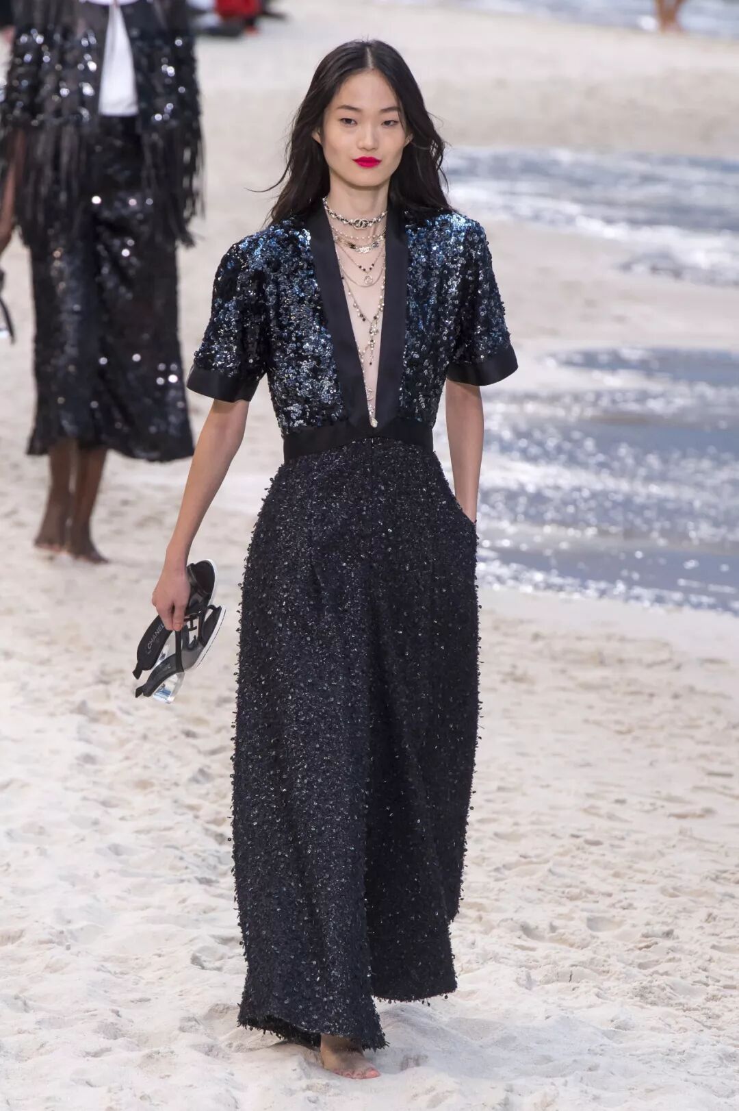 雪纺裙上的刺绣亮片营造出Chanel这个品牌自带的“大佬”光环,看起来华丽且高贵