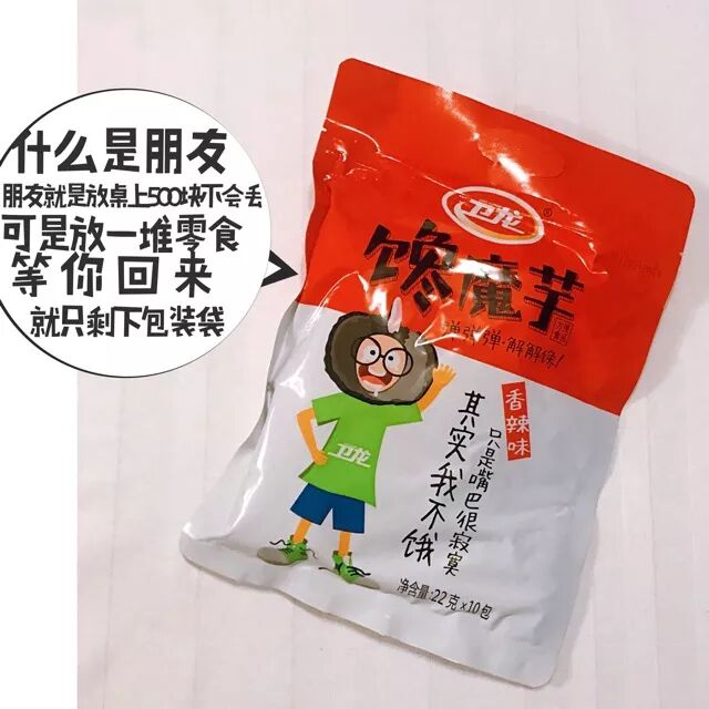 卫龙馋魔芋香辣味。晒货区出现频率超高的零食。第一次吃感觉稍微有点儿油油的,但是吃了就想继续吃,好吃到停不下来。鲜香麻辣,魔芋条滑滑的口感超好,有点儿像毛肚儿。