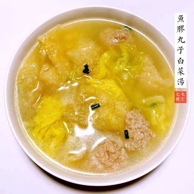 跟炸猪皮一样的泡法,泡3小时后左右,加面粉或淀粉洗去表面油脂,过水焯一下。煮了鱼胶丸子白菜汤,感觉味道和炸猪皮好像啊,果冻一样的口感,滑滑嫩嫩,非常好吃。