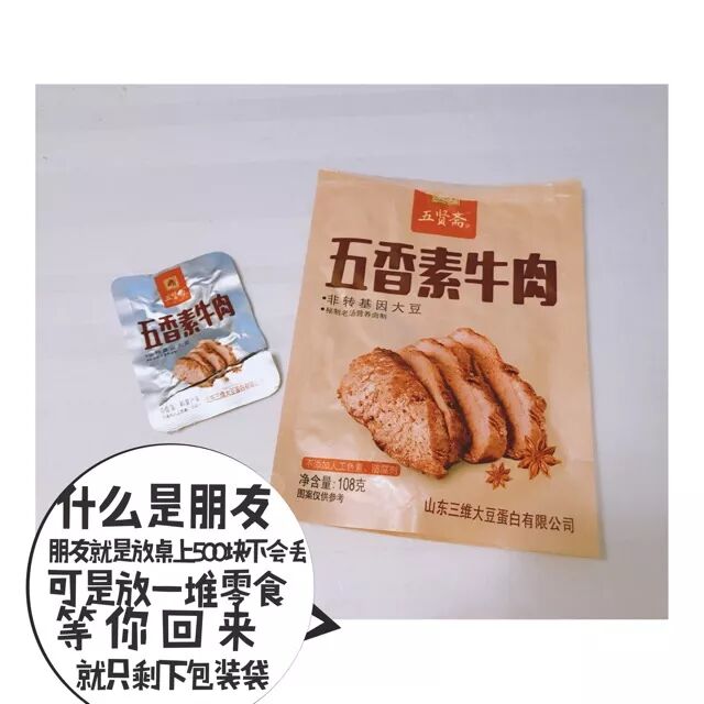 五贤斋五香素牛肉。面筋的口感,咸香可口,不会过油。买回来就抢着吃,老公居然还藏了一块当私房零食,被我发现吃掉了,哈哈哈。
