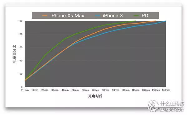 再对比一下PD快充,iPhone Xs Max上,整体充电时间PD比12W快了10分钟。