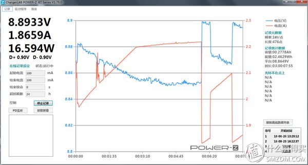 由于软件版本问题,中间出现一次关断。所以曲线截图只有前半段9V档位,后面的部分曲线缺失。不过我们主要还是看前半段高功率维持,也不影响最终的测试结果。