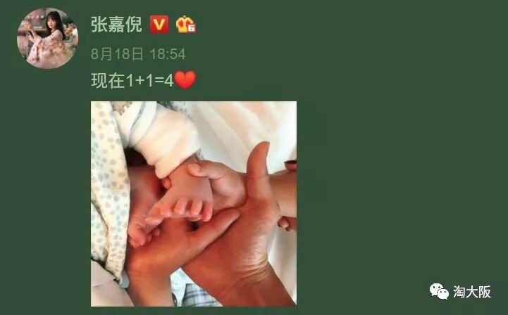 上个月顺嫔娘娘张嘉倪,也产下二胎,晒出一家三口手捧孩子小脚丫的照片,配文“现在1+1=4”。