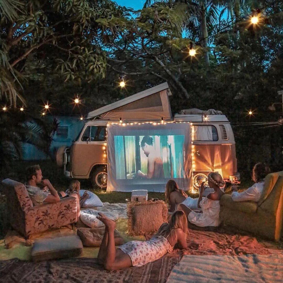 海边看日落、夕阳,在森林里野餐,去沙滩上嬉戏,到国家公园探险露营,甚至拉起了帷幕放起了露天电影。
