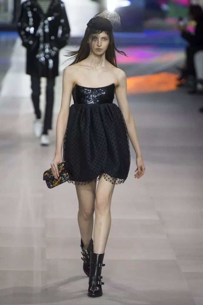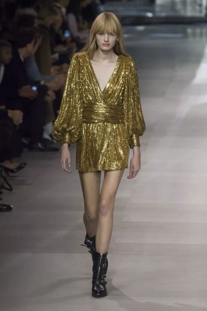 所以今天CELINE的这场大秀和曾经的SLP“雷同”、“撞款”,也就不足为奇了:短到不能再短的花苞裙、紧到不能再紧的皮夹克、闪到不能再闪的连身裙…这就是HediSlimane