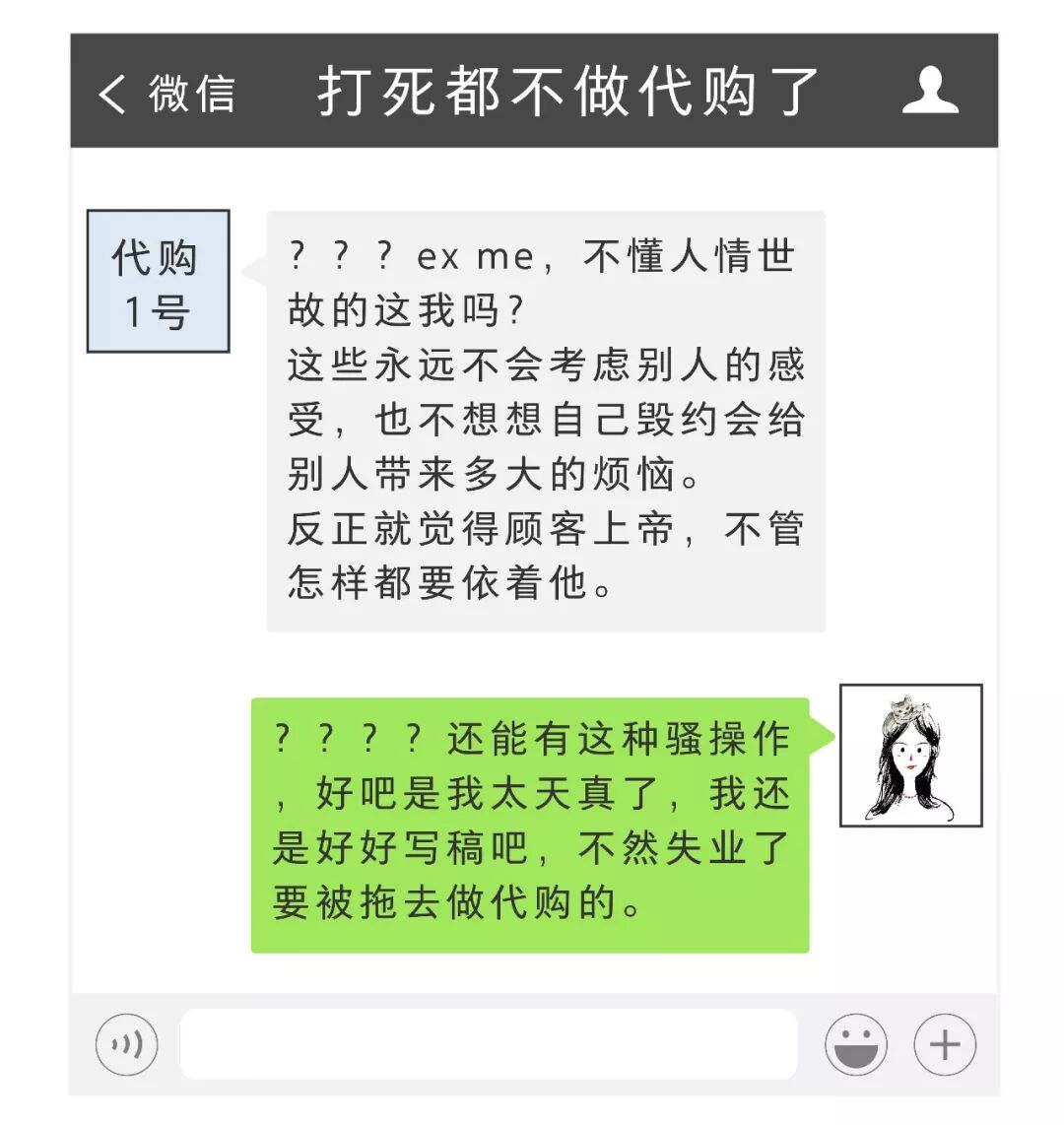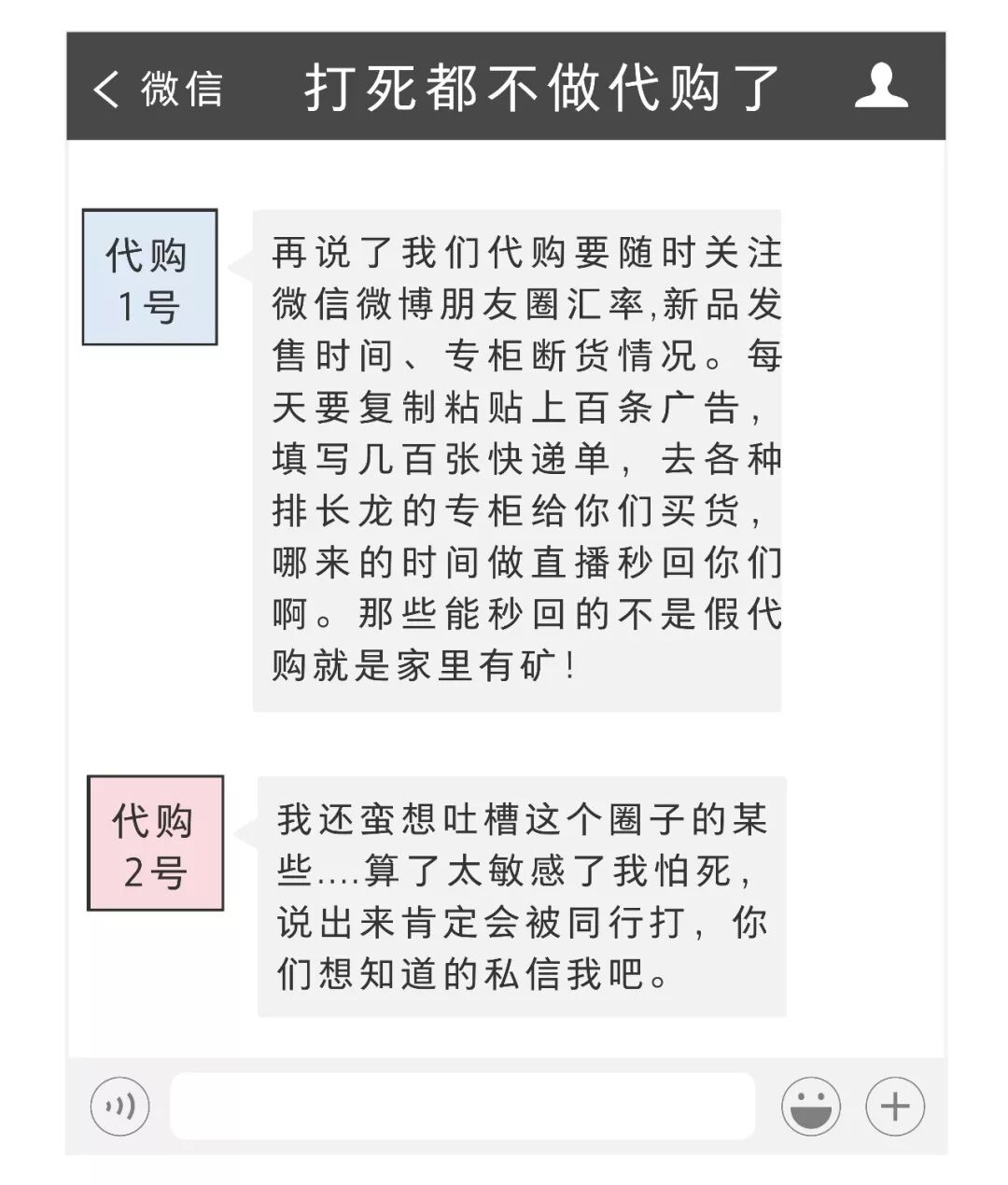 言归正传。上周末,我本来打算找我的代购买东西。还没聊两句,我的代购就说太累,不打算做了。而且说最近挺多代购姐妹们都罢工了,让我且买且珍惜![]()