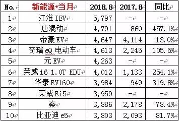 2018年8月份新能源市场,市场销量完成10.1万辆,比上年同期分别增长49.5%。其中纯电动汽车产销分别完成7.2万辆和7.3万辆,比上年同期分别增长24.2%和31.7%;插电式混合动力汽车产销分别完成2.7万辆和2.8万辆,比上年同期分别增长102.3%和130.8%。