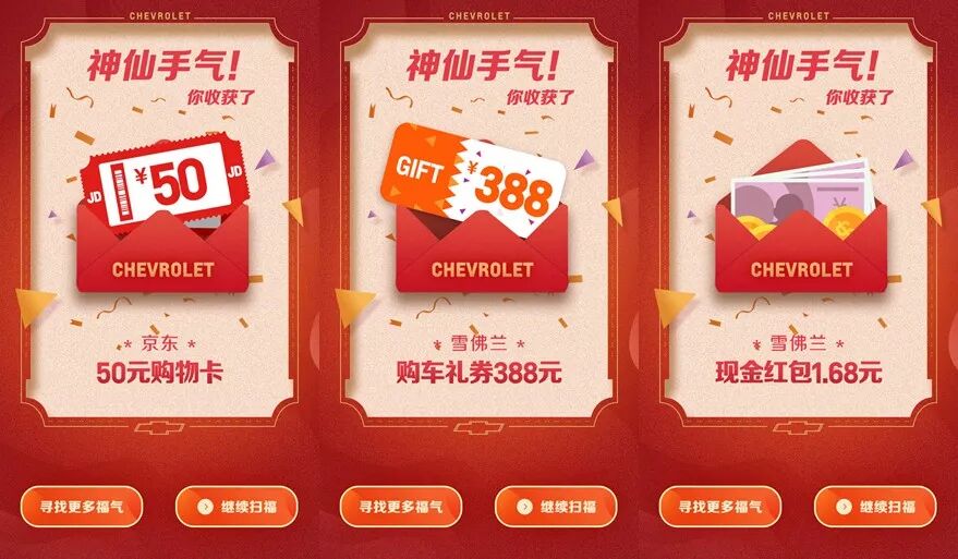 打开“福气”后还能获得小额红包、礼券、购车礼金等等。值得一提的是,如果你到本地雪佛兰经销商展厅参与活动,会有更大的红包以及惊喜礼品,所以有兴趣的朋友可真不要错过这次机会。毕竟好玩之余还有额外的收获,何乐而不为?