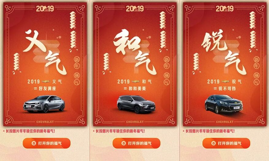 就好像支X宝集五福一样,雪佛兰也有自己的特别活动,打开小程序授权关注后,就能够通过扫雪佛兰车标赢取你的专属“福气”,给自己加持一个“霸气”或“财气”光环,让你的2019年运气更旺。你还可以分享给朋友,让他们也来共享福气,比比看谁的标签更牛!