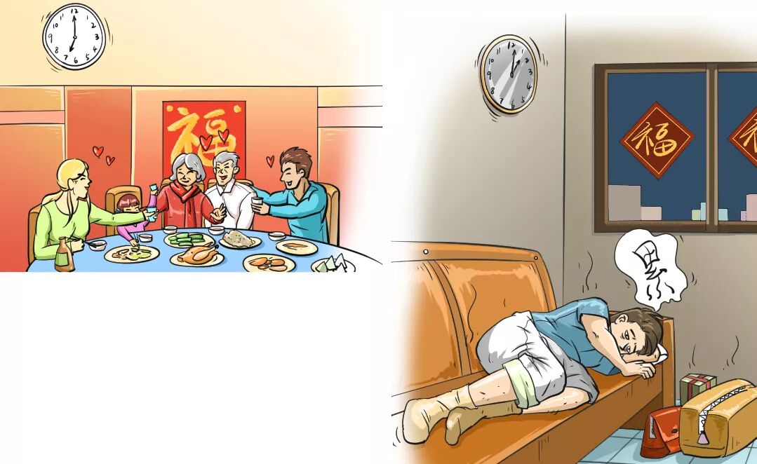 B回到家累得一塌糊涂,年夜饭都不想吃就想倒头就睡。