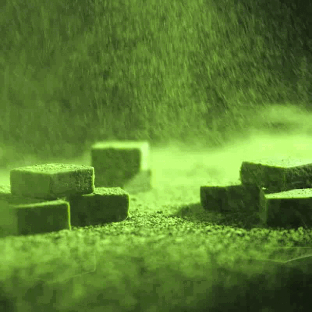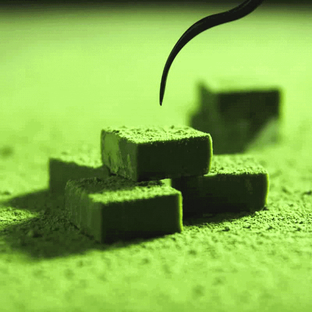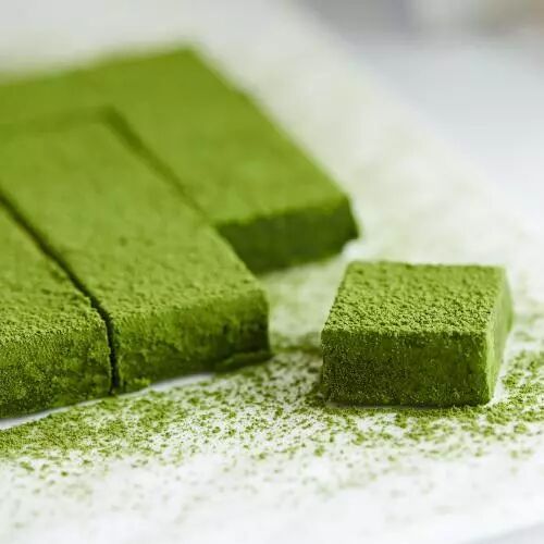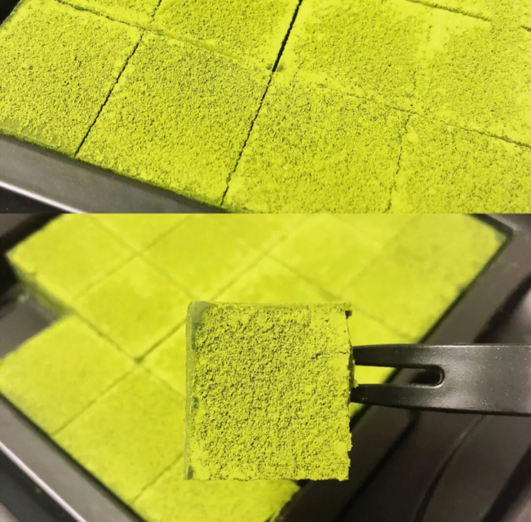打开盒子就是一个个整齐的小方块,像棋盘格一样排列在盒子里,厚厚的抹茶粉,就像丝绒一般覆盖在生巧的表面。