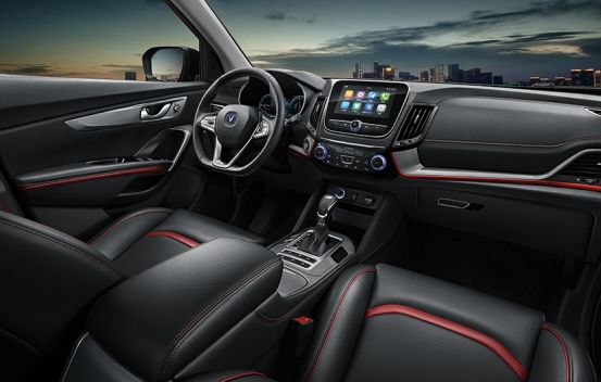 有了高颜值的外表,里子当然也不能差,长安新CS55的车内设计同样时尚前卫,并提供了两种配色的内饰。X型中控设计和丰富的线条很有立体感,充满视觉冲击力,用料和工艺也十分考究,大量软性材质包裹配合缝线工艺,加上Nappa皮纹座椅,营造出极强的高级感。仿碳纤维的饰板配上红色饰条和平底方向盘,也散发出强烈的运动气息。