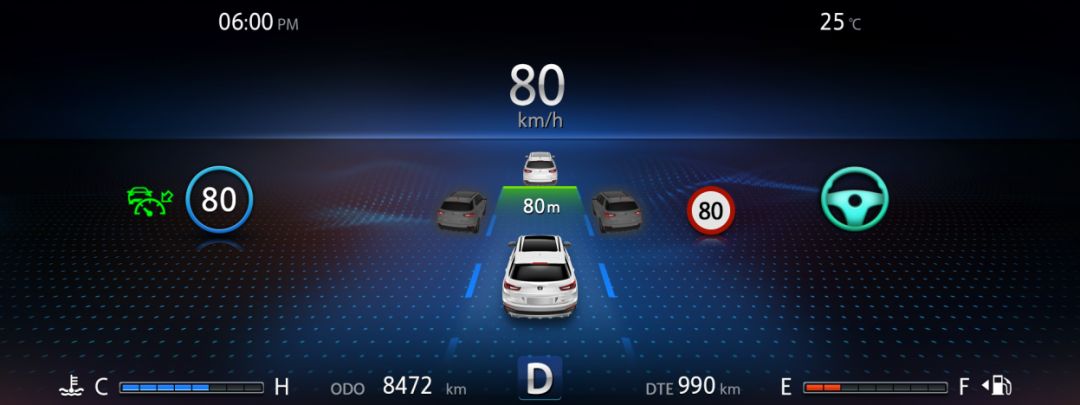 此外,IACC还有场景重构功能,通过摄像头和雷达,车辆距离、车辆类型、道路限速等信息可以重构呈现在仪表盘上,即使是进入视觉盲区,四周车况也可以通过仪表盘一览无遗,大大提升了安全性。