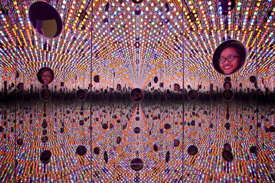 对草间弥生来说,无限的光场意味着身体与宇宙合而为一的非物质化;然而,对于大多数参观者来说,这是一张张超吸睛的自拍照。