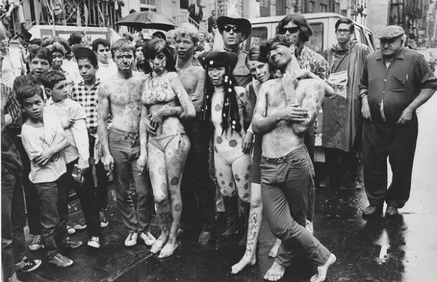 当“爱之夏”summer of love到来时,草间弥生试图把自己定位成一种flower power的高级女祭司,举办“人体节日”,在这些活动中,她用圆点画裸体派对参与者。她把这些事件带到纽约周围的地点——在纽约证券交易所对面、自由女神像的台阶上——引发了反对克松选举和越南战争的裸体抗议。