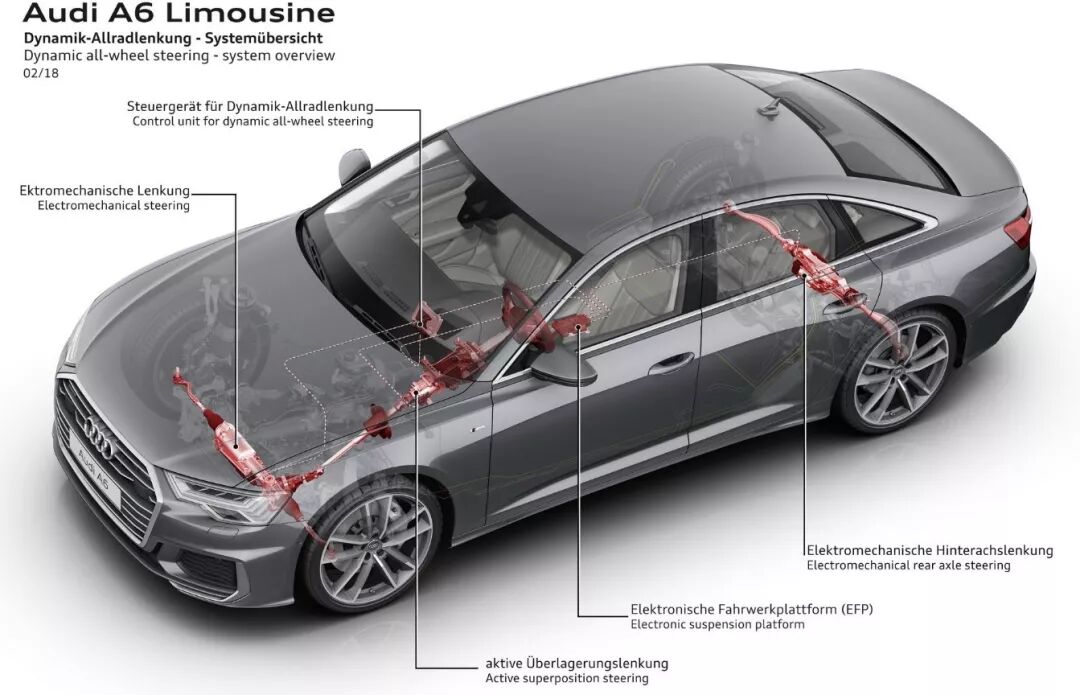 遗憾的是2.0T车型应该是不会配备48V。之前写过一篇稿介绍48V轻混,有人质疑这玩意有什么用,现在奥迪给出答案了。比方说这套基于48V的后轮辅助转向,在后悬架上增加了一条电控主动toe臂,低速时最多可朝转向的相反方向偏转5°,以降低转弯半径;而高速时则可朝转向相同方向偏转2°,拉住车尾提升稳定性。当然,会有人说这种技术以前就有,但在高压系统中,它可以动作得更迅速、活动范围更大。其他的48V独享新功能,比如55-160km/h速度域松油门熄火滑行、动能回收、更快的启停等等,2.0T车型也一并享受不到了,不过没关系,喜欢这些先进科技的消费者完全可以购买3.0T版本,国内也会有的。