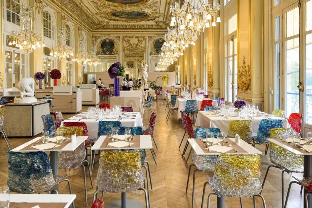 奥赛博物馆餐厅是老火车站宾馆的一部分,由建筑师Jean-Michel Willmote设计,保留着1900年代的镀金天顶壁画。使用金色与橘色调装饰装潢的空间相当前卫。