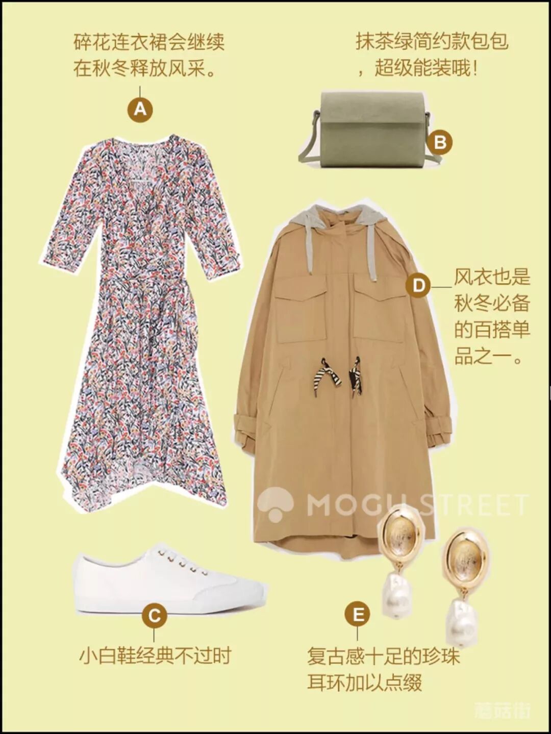 风衣外套绝对是连衣裙的好搭档!再搭配一双小白鞋,时髦度直线飙升,音乐中露出碎花的裙摆,也为整身look增添浪漫风情。