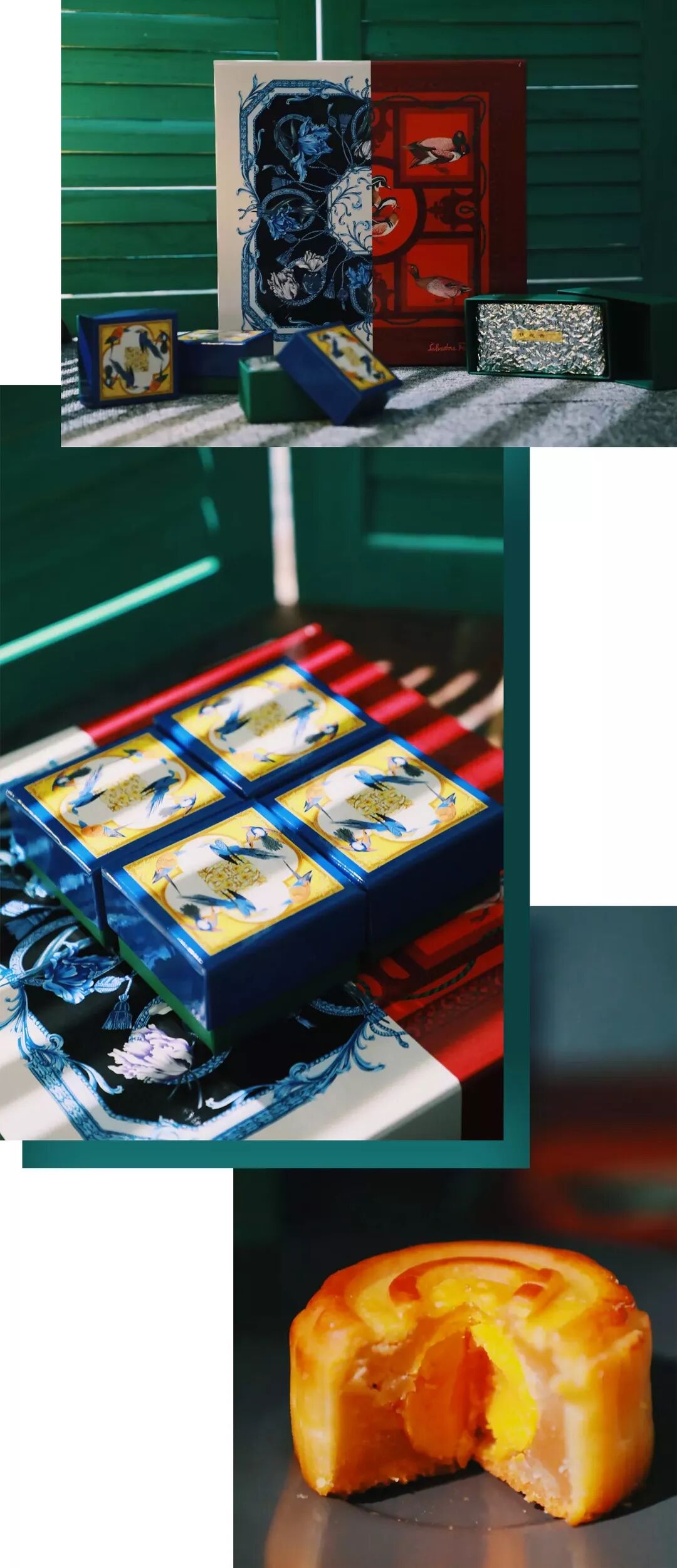 里面也是一样的绚丽设计,菲拉格慕也在月饼上印了代表品牌的马蹄扣,月饼都是莲蓉和蛋黄这些普通口味。