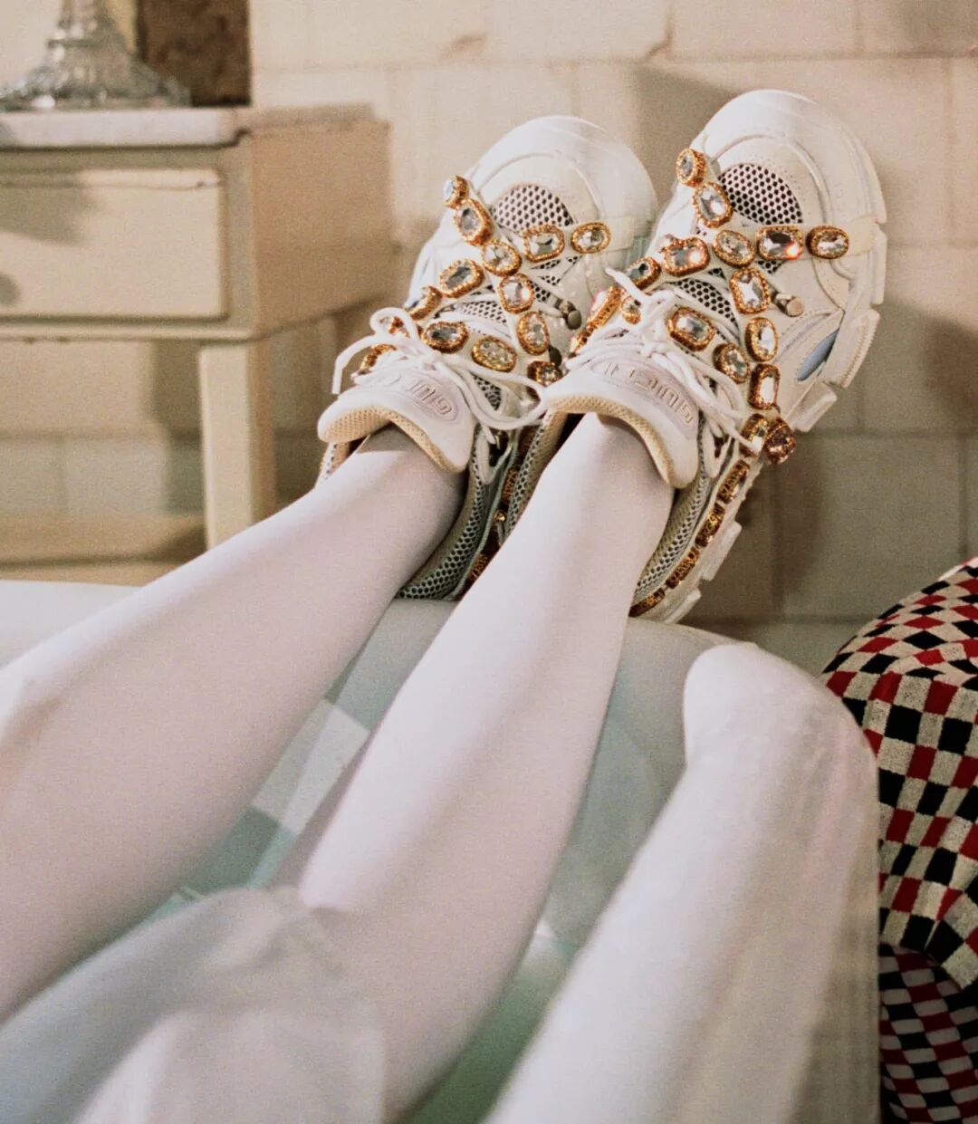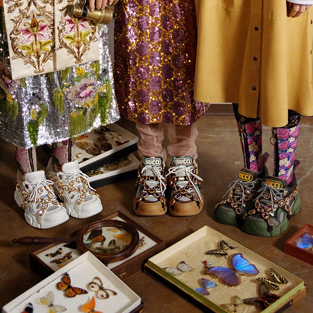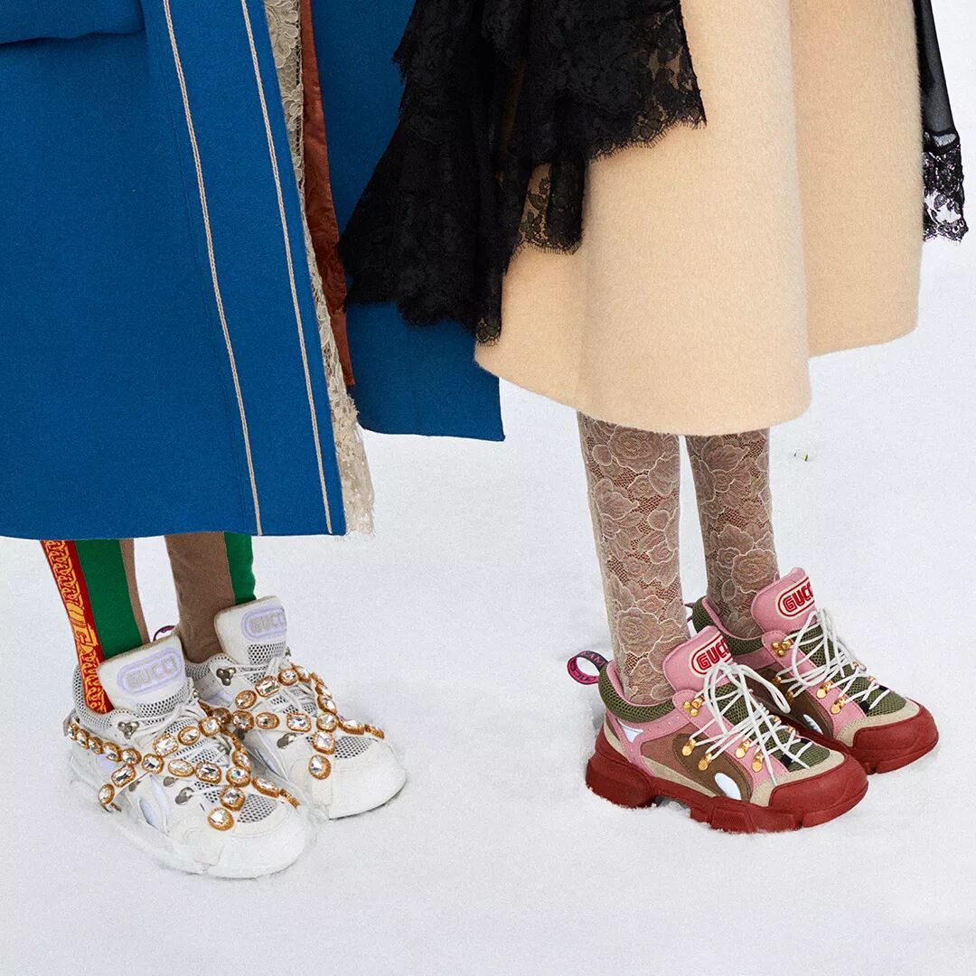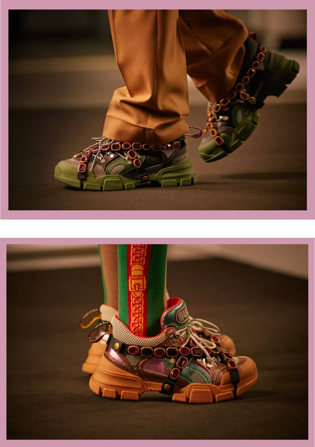 这种闪烁元素贯穿了 Gucci 2018 秋冬系列,除了上面金属配色的闪闪包,还有饰有发光水晶的全新老爹鞋系列 —— Flashtrek。