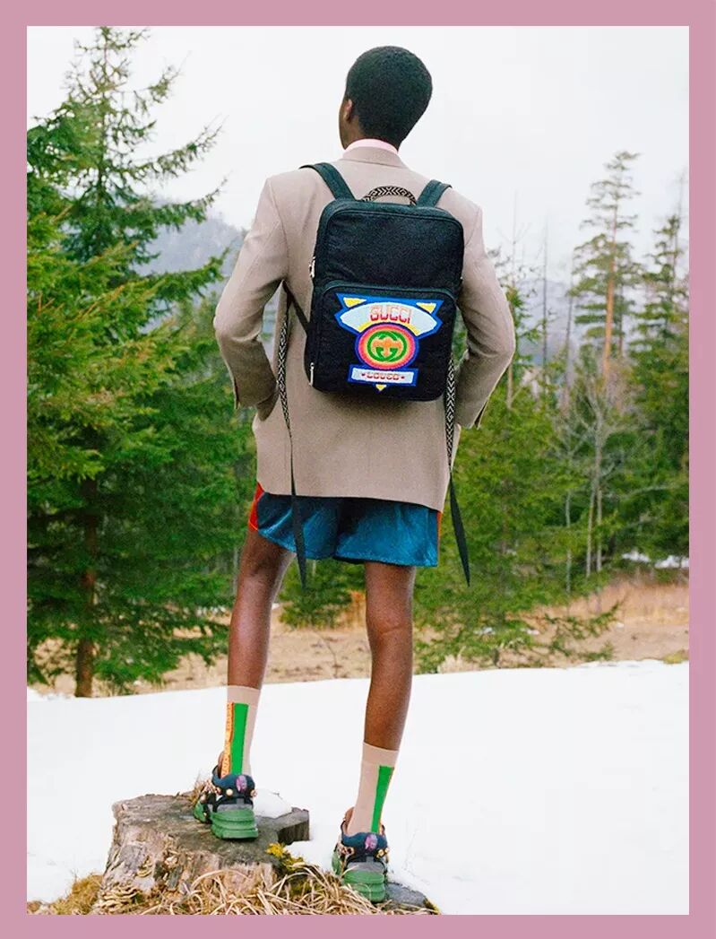 他俩还默契十足地背了新系列里,设计充满80年代复古风、饰有互扣式G字样的尼龙材质的背包。