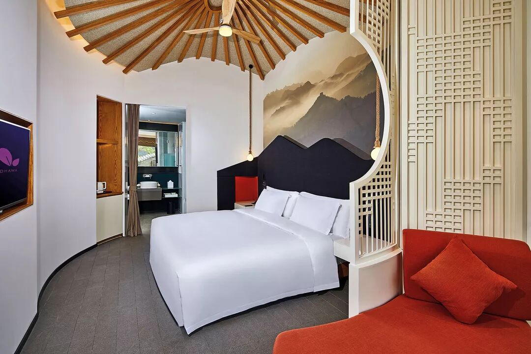 酒店拥有200间 “眠茧”(客房与套房),其设计以环绕四周的绵延山势为灵感,饱含文化底蕴。山谷房很有特色,以该地区传统四合院为灵感,山谷房为旅途中的情侣们营造慵懒舒适、山景悦人的空间。