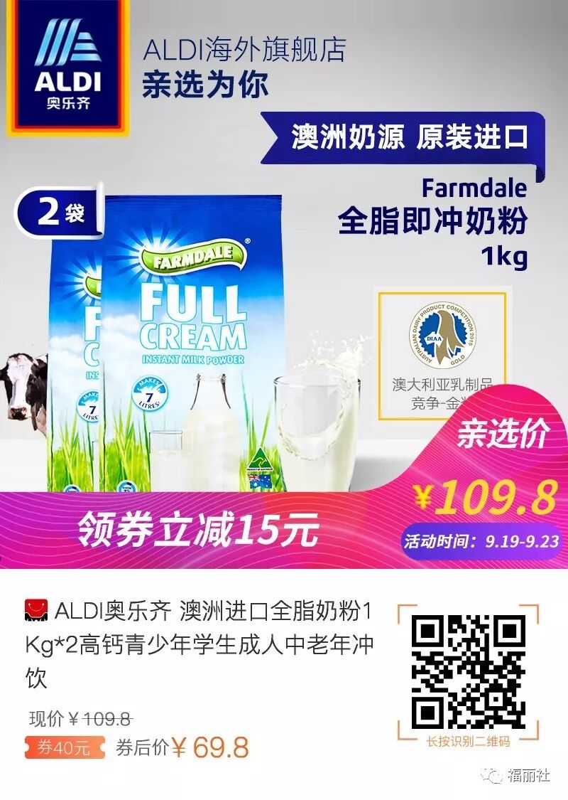 【败姐严选】ALDI奥乐齐旗舰店全脂奶粉1Kg`2,澳洲进口全脂奶粉,高钙高蛋白,即冲即溶,非常方便,券后69.9,非常好货放心入~