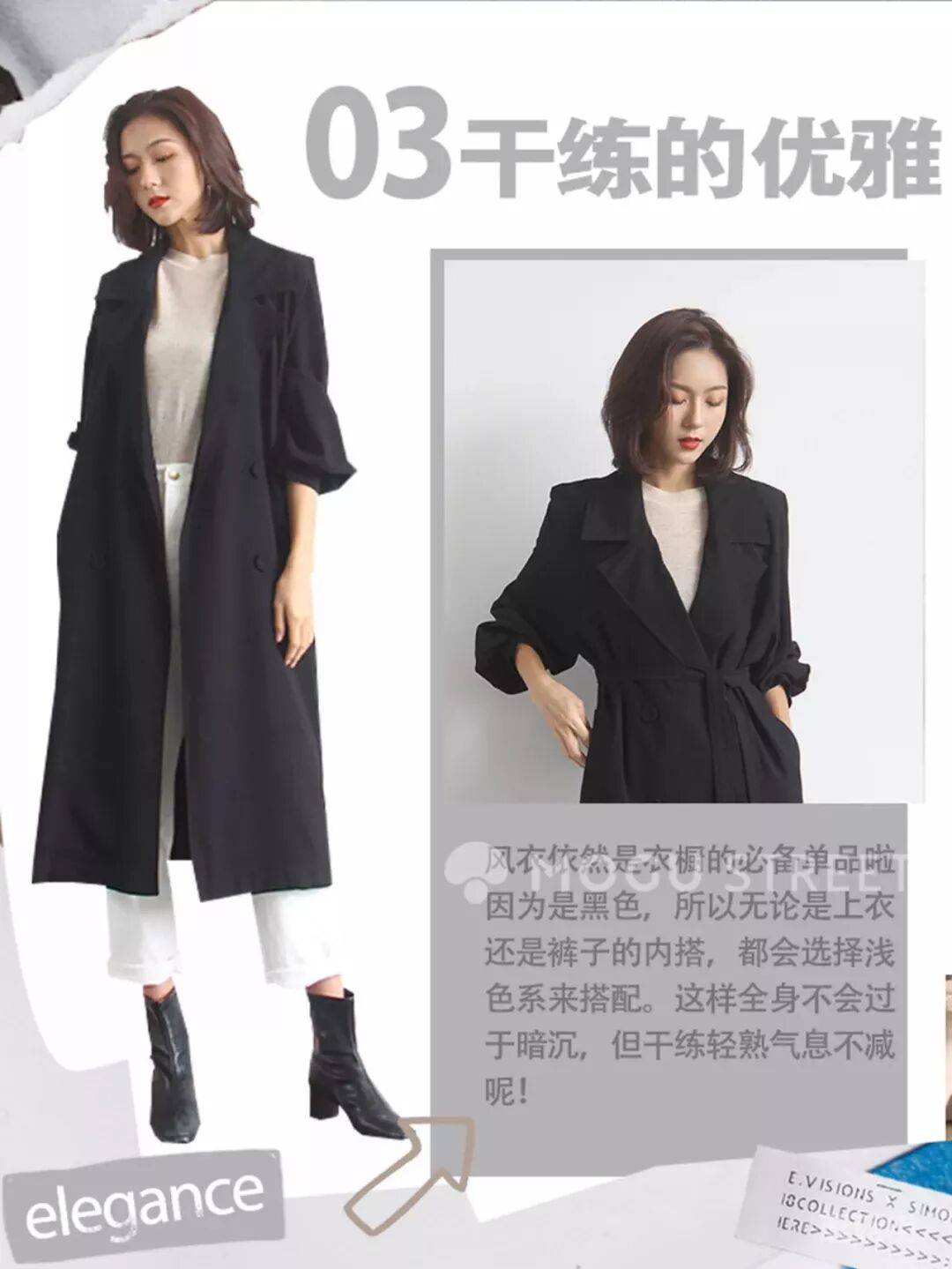 风衣可以说是上班族早秋必备单品啦!跳出常见的卡其色,选择了气场更为强大的黑色,内搭奶茶色针织白色直筒裤,简介干练霸气外露!