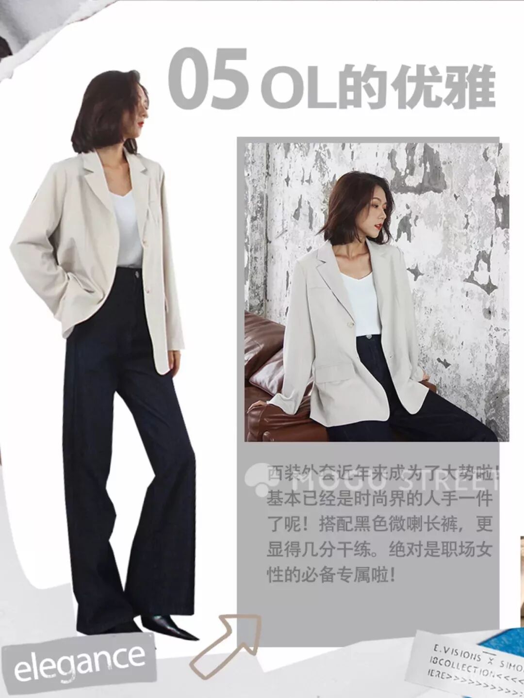 每一个上班族都有一件西装外套吧!近年来西装外套的流行势头也是一路飙升,基本是时尚人士们人手一件的单品啦~搭配黑色微喇长裤,让你轻松腿长一米八!小个子的显高神器,利落干练气场满分。