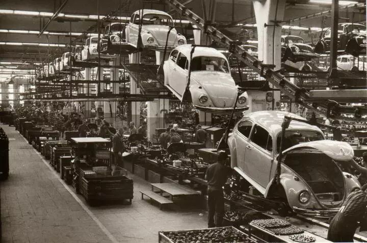 图为大众汽车1969年的生产流水线,1969年啊盆友们