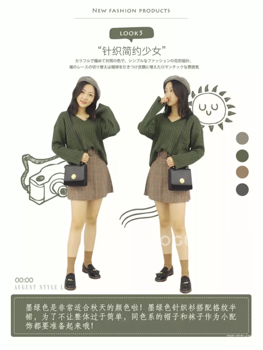 墨绿色超级适合黄皮妹子们,上身轻松显白两个度!针织衫搭配格纹半身裙,简约优雅,温柔学姐就是你啦~